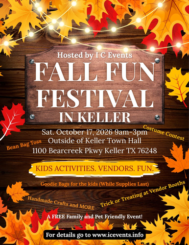 Come out and join us on Saturday, October 17th for a FREE fun festival outside of Keller Town Hall. There will be vendors, shopping, bean bag toss, costume contest for kids 12 and under at 11am and pet costume contest at 11:30 am (1st, 2nd and 3rd place prizes will be awarded and candy for participation) and goodie bags for the kids*!